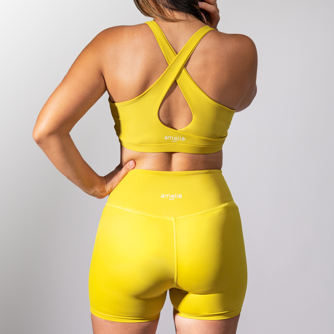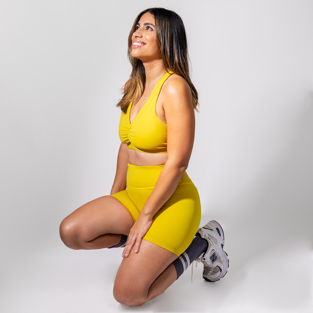 Set de 2 piezas, color warm yellow (amarillo cálido), el top tiene un detalle fruncido en el pecho y la espalda cruzada para darle mucho soporte. El short es corto, de cintura alta ideal para resaltar la figura.