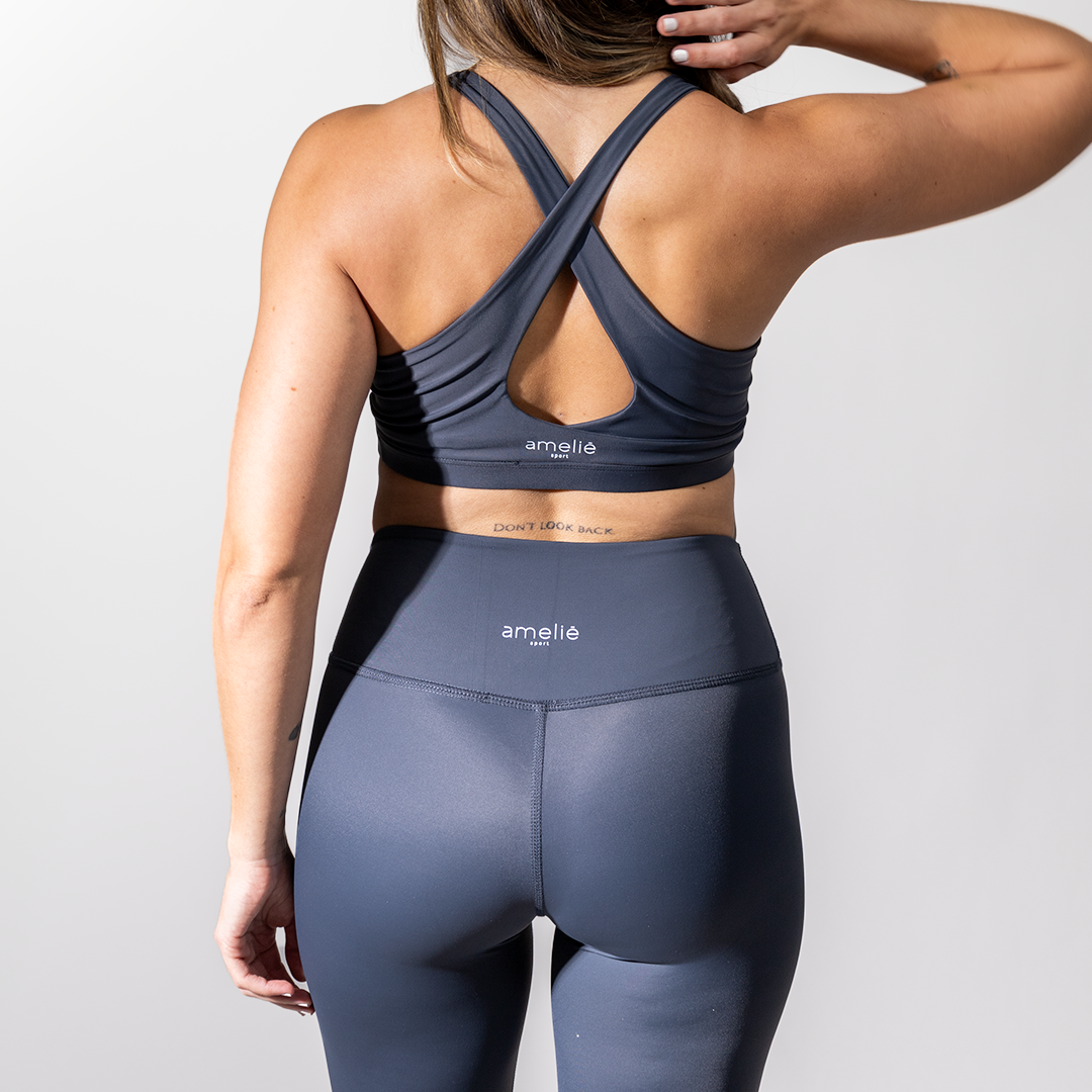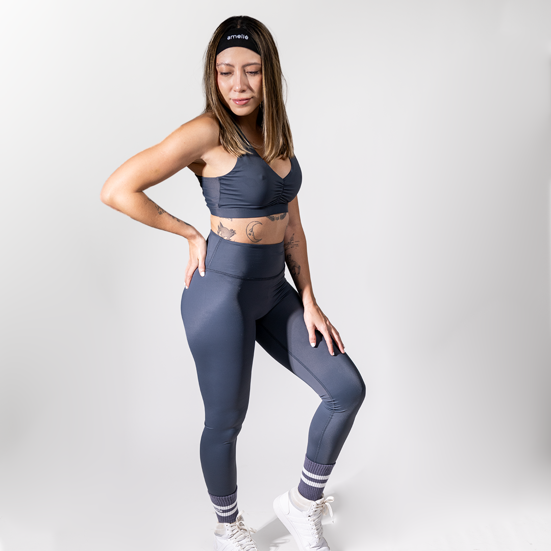 Set de 2 piezas, color Moon grey (gris luna), top con detalle fruncido en el pecho y espalda cruzada para mucho soporte, leggings con cintura alta que amolda la figura.