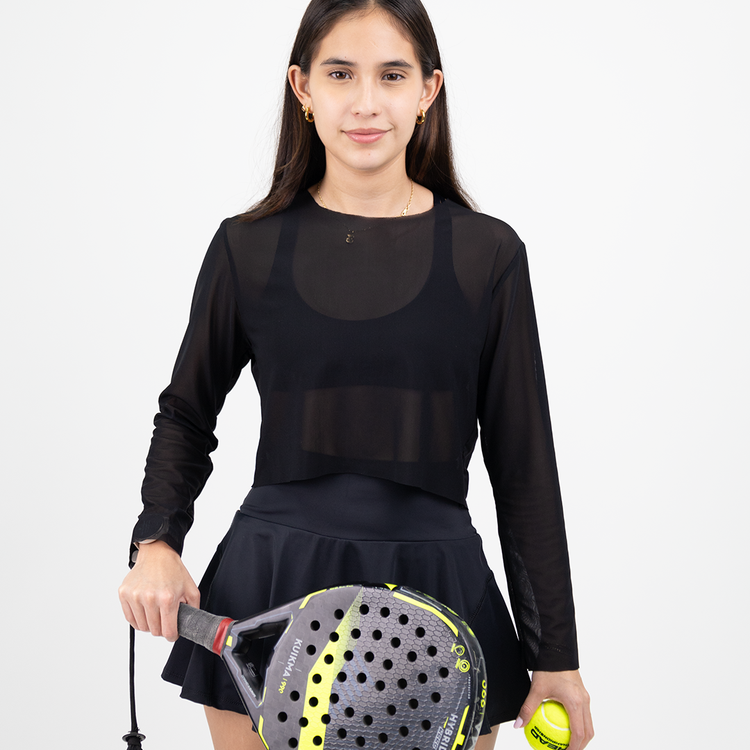 Dale a tu conjunto Amelié un toque de elegancia con nuestra blusa de tul negro. Ideal para padel, tenis o para hacer ejercicio en general.