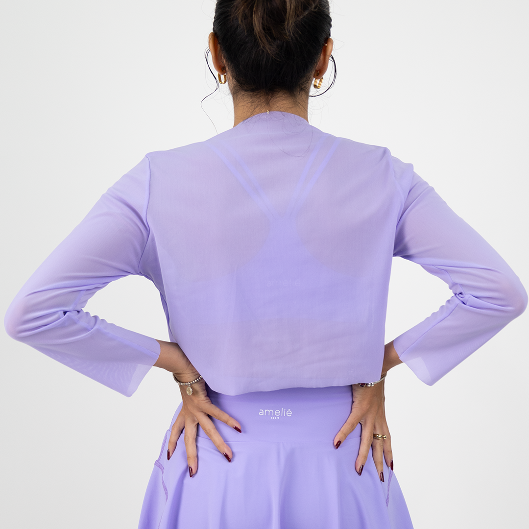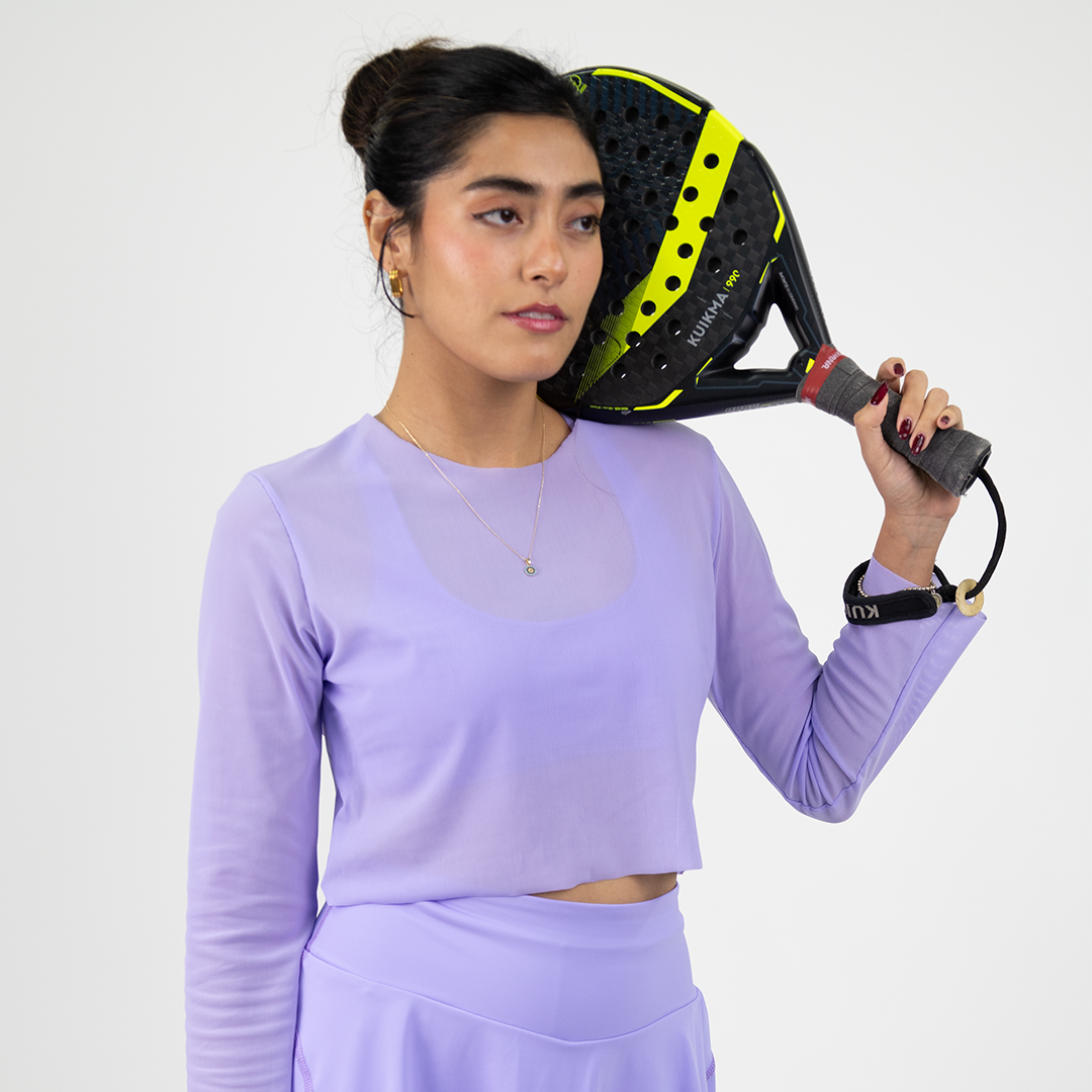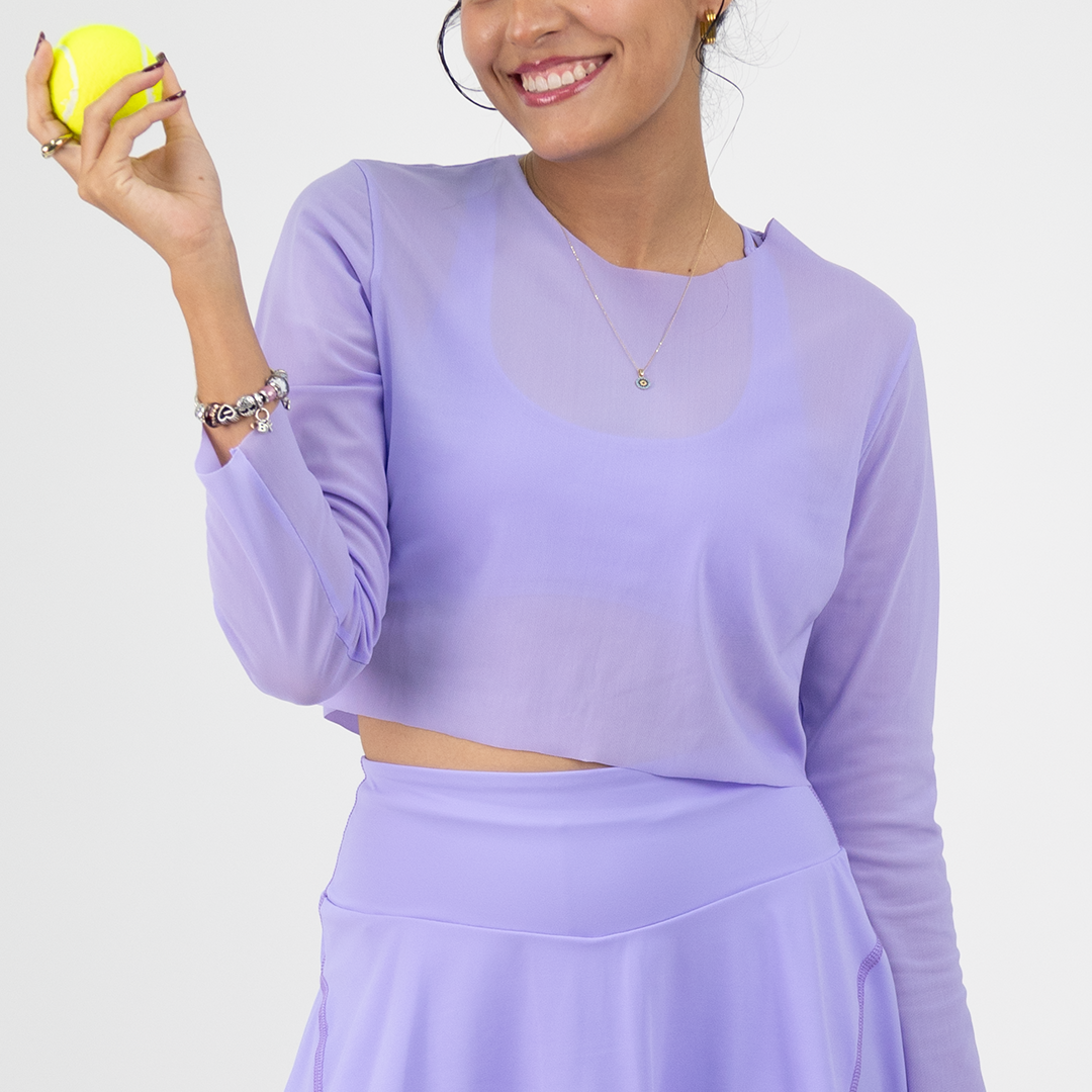 Dale a tu conjunto Amelié un toque de elegancia con nuestra blusa de tul lila. Ideal para padel, tenis o para hacer ejercicio en general.